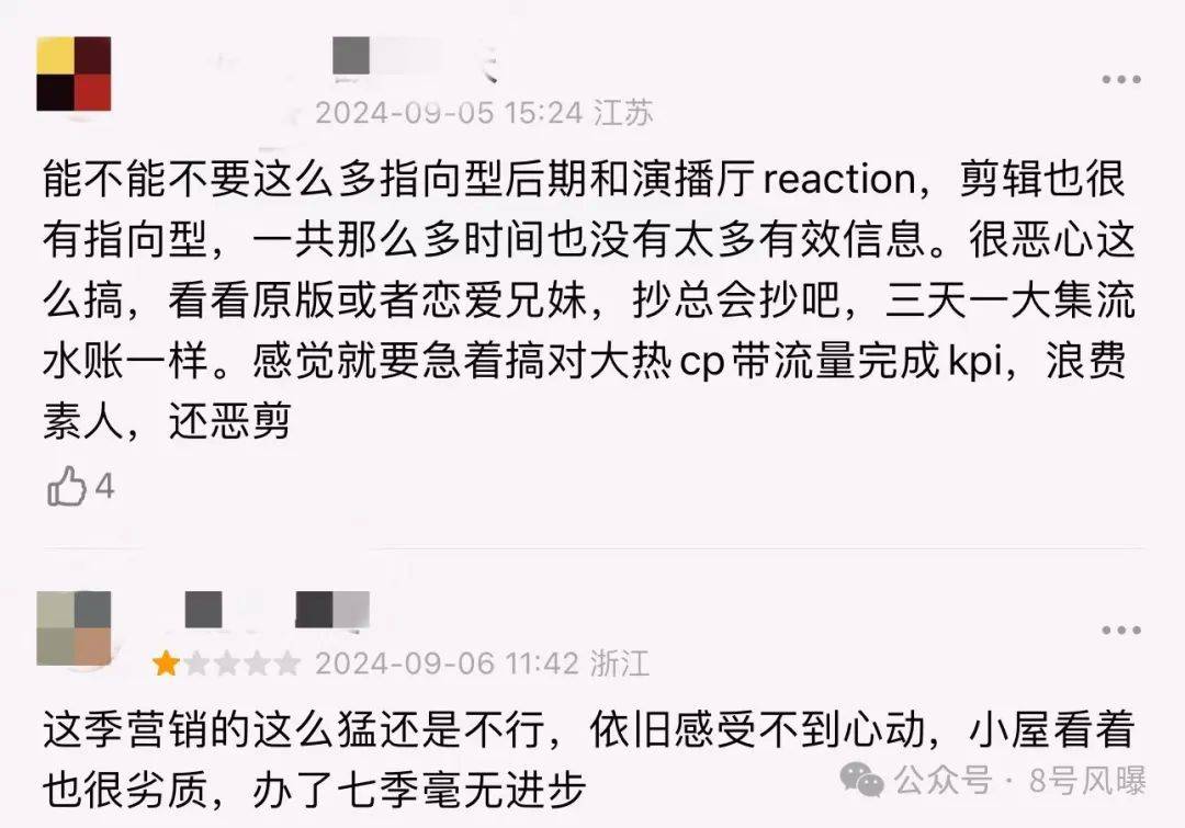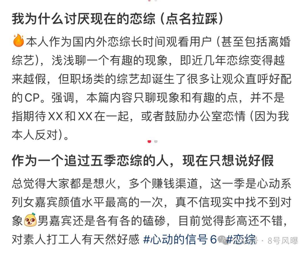 观众还表示一些素人嘉宾很像是为了知名度来混脸熟的,感觉节目组是为了趁热度再炒出一对CP获得KPI,这样营销是不会让观众感到心动的。