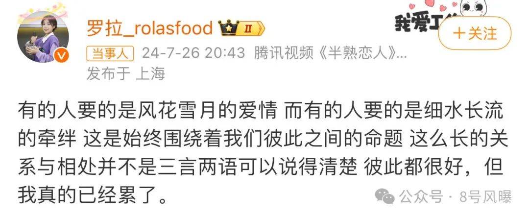 罗拉在7月底发的一条博文疑似和王能能要分手,消息一出引发网络热议,粉丝们纷纷表示不敢相信。