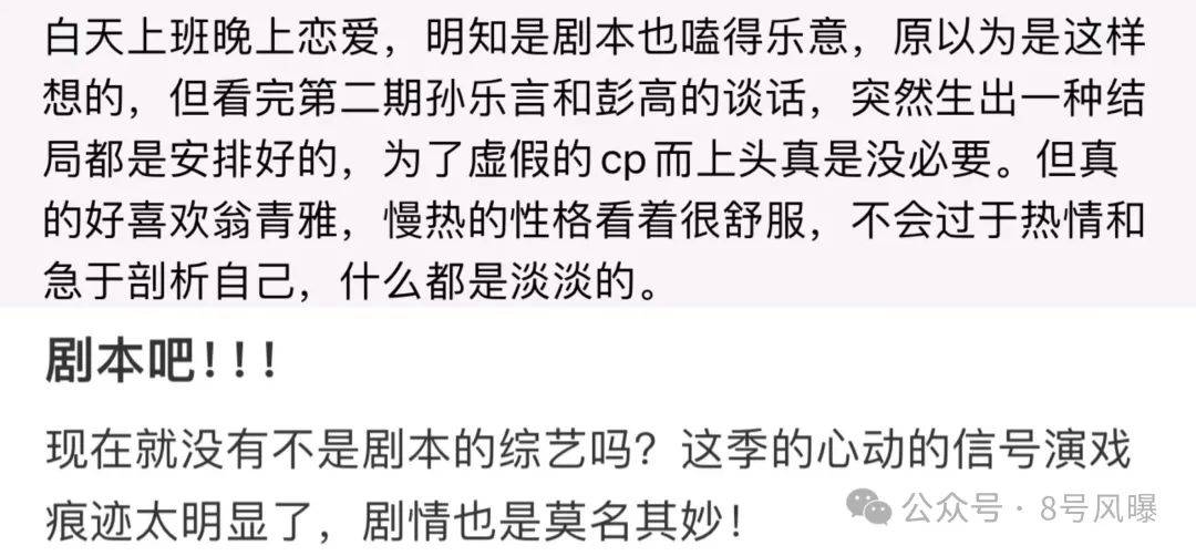 一些观众发现嘉宾互动的整体内容导向像是有剧本在推动,表示从节目中的嘉宾孙乐言和彭高的对话就能看出来结局都是安排好的,他们的演戏痕迹有点儿太明显了。