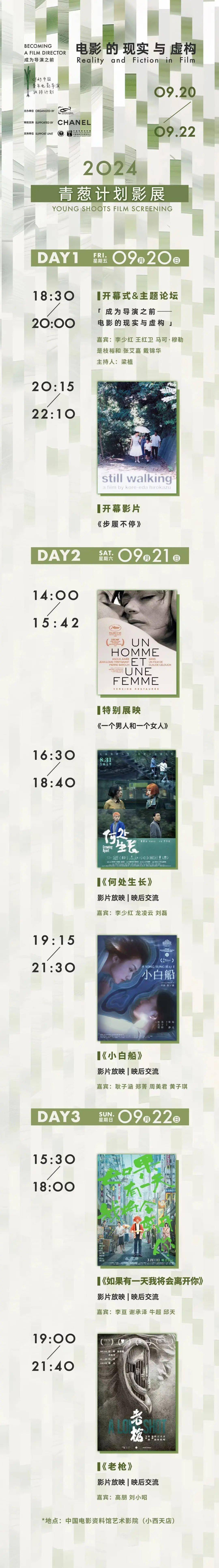 中国电影导演协会携手香奈儿,支持青葱计划助力中国电影积蓄青年创作力量。9月20日至22日,青葱计划“成为导演之前——电影的现实与虚构”主题影展将在中国电影资料馆艺术影院(小西天店)举办。本次影展包含「大师重温单元」开幕影片《步履不停》、「青葱聚焦单元」《如果有一天我将会离开你》《何处生长》《老枪》《小白船》和「特别放映」《一个男人和一个女人》共6部电影作品。通过放映、论坛、学术交流等不同形式的活动为年轻创作者提供对话平台,探讨不同视角下的创作表达和内容呈现。