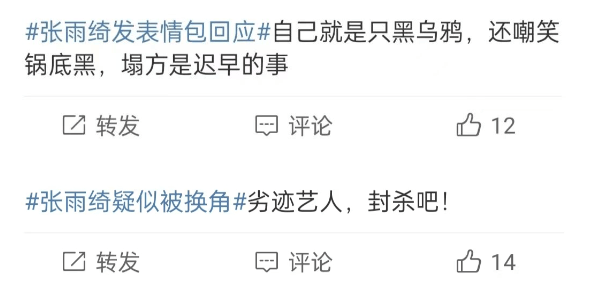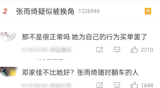 很快,张雨绮疑似换角的事情,就登上热搜,引起了许多网友的热议,评论区很多人都觉得张雨绮活该被换,这是在给自己的行为买单,感觉她随时都要翻车,况且邓家佳演技比她好。