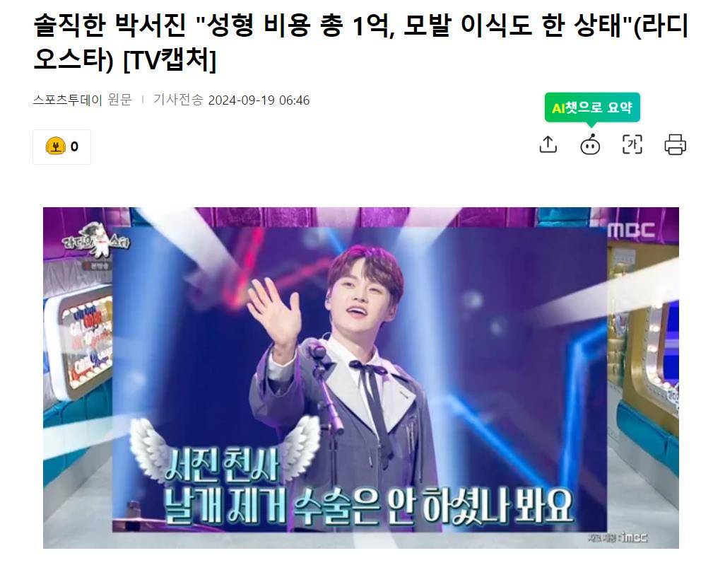 对于粉丝们对整容手术的反应,朴瑞镇表示:“有时候我会因为不了解我的粉丝而感到尴尬”,不久前,我在 YouTube 上被评为“整容效果最好的 5 名歌手”之一,我的粉丝说他们是在保护我,并留下评论说,“他只动了他的眼睛和牙齿”,“因为他修复了所有需要的东西”。