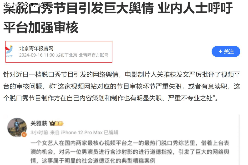 《北京日报》与《北京青年报》相继刊发文章,对资深制片人关雅荻针对某起娱乐事件发表的严厉批评表示了支持,相关视频平台和节目制作方在处理此事时存在重大疏忽与责任缺失。