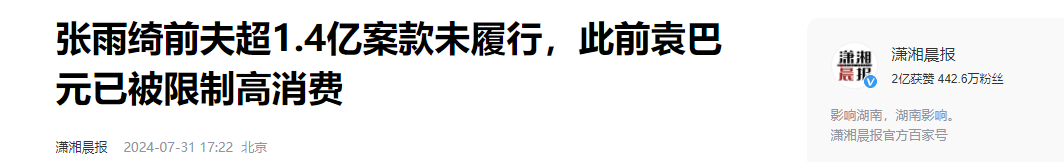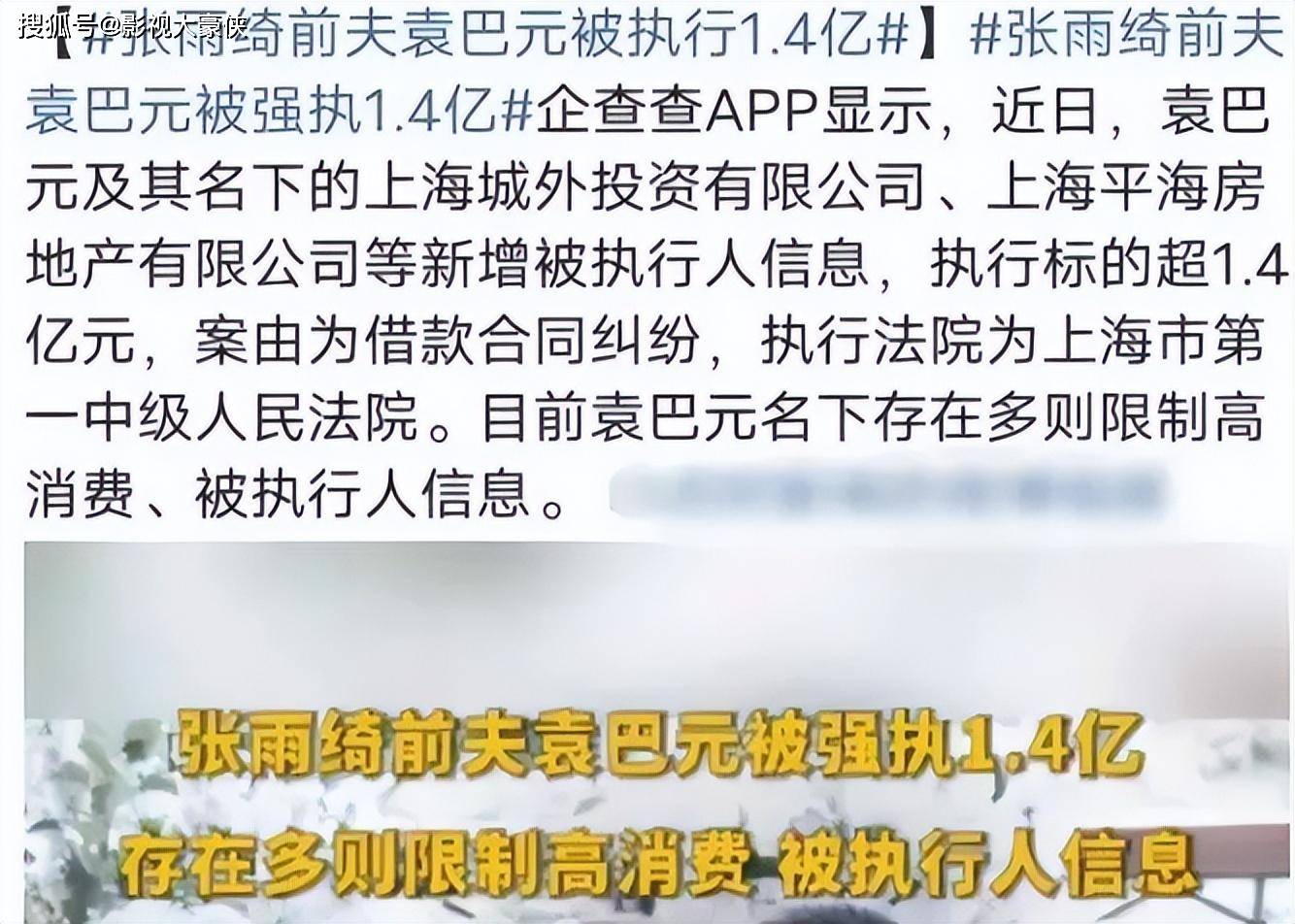 参考资料:潇湘晨报2024-07-31 17:22——张雨绮前夫超1.4亿案款未履行,此前袁巴元已被限制高消费
