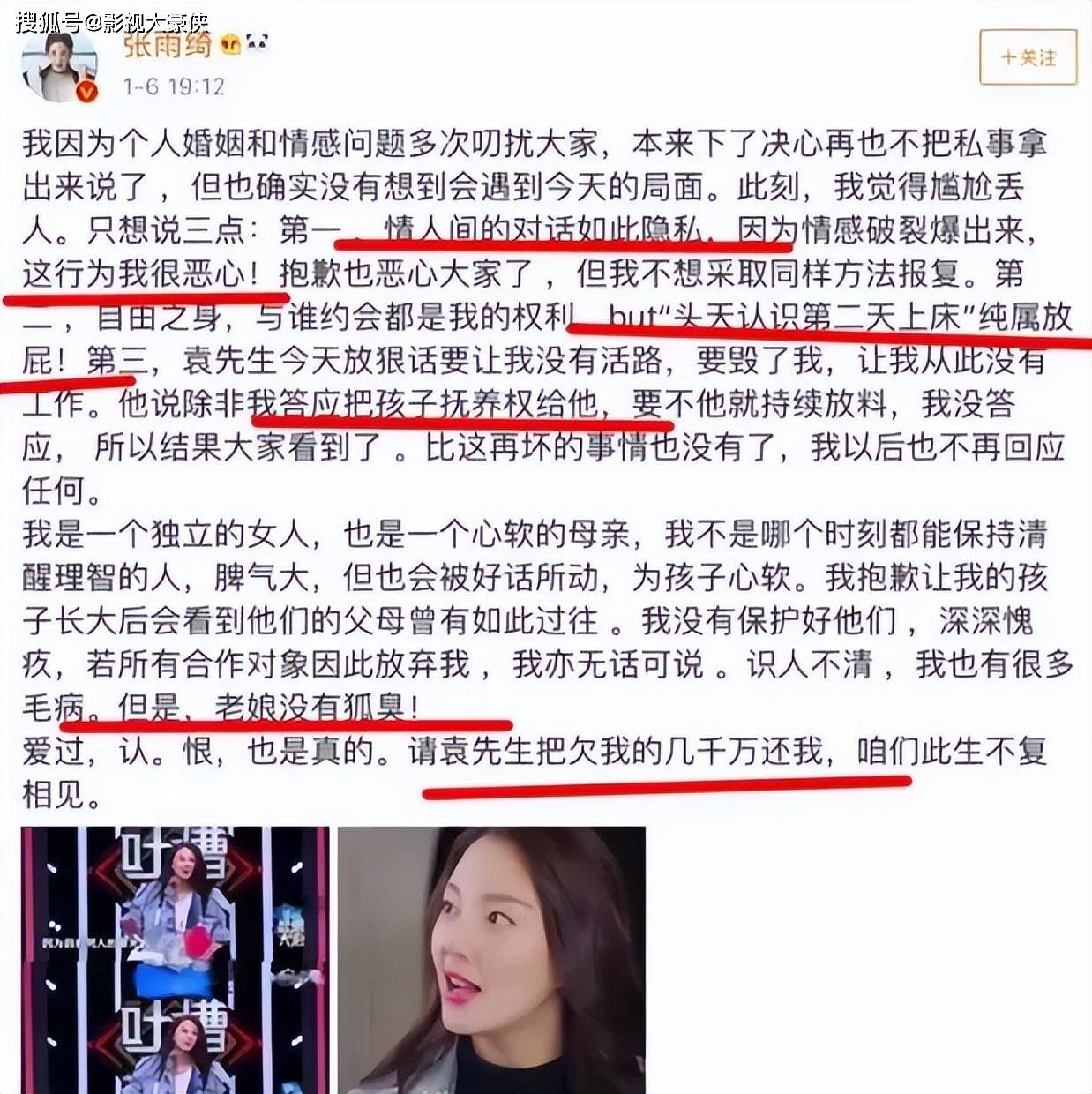 对此张雨绮没有选择沉默,她通过一篇情真意切的长文,正面回应了袁巴元的指控,坚决否认了所有不实言论,并指出这一切皆因袁巴元为争夺孩子抚养权而采取的策略,她直言自己清白无辜,并反诉袁巴元拖欠其巨额款项,要求对方归还。