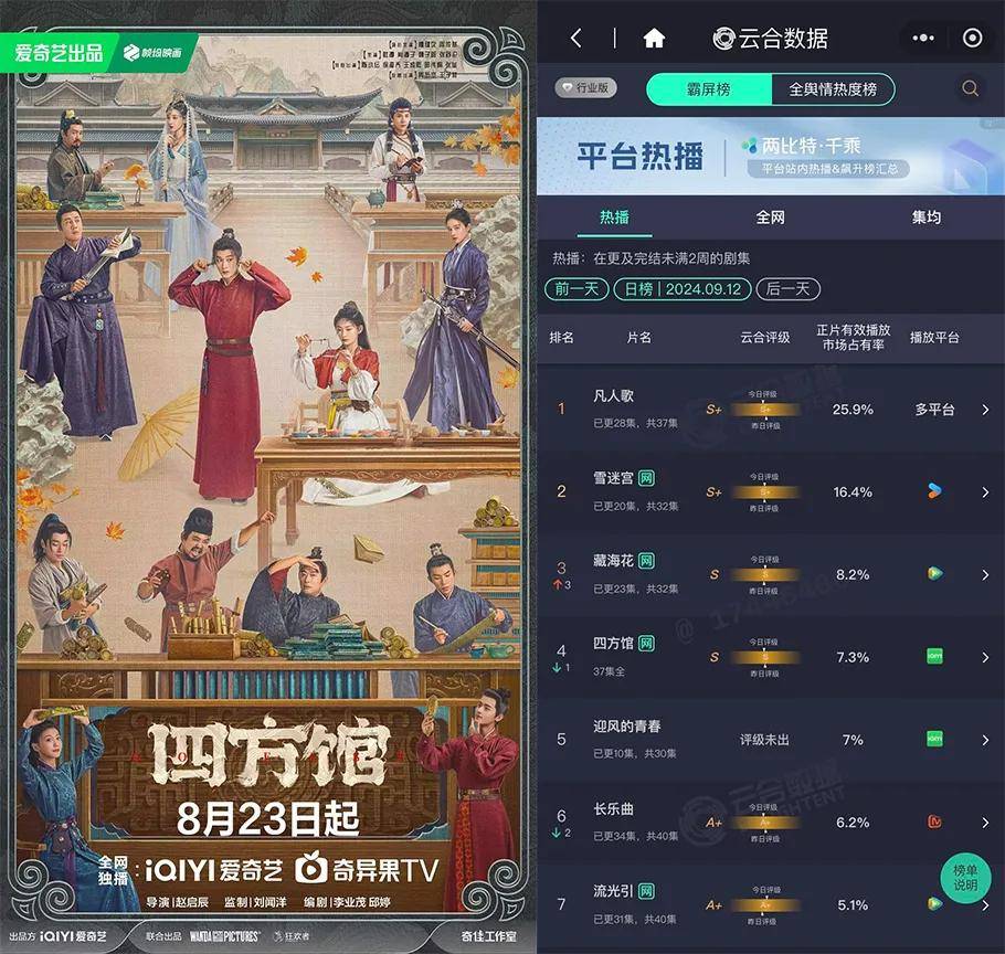 古装探案喜剧《四方馆》即将迎来收官。云合数据显示,截至2024年9月13日发稿前,《四方馆》位列连续剧热搜榜第四名,正片有效播放时长占有率为7.3%。