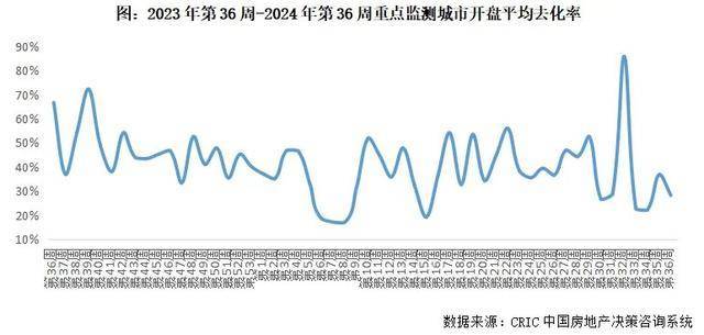 开盘项目去化率在30%左右低位波动。第36周平均去化率约为28%,环比再下降9个百分点,分城市来看,北京、苏州、杭州所推项目大多位于郊区,整体开盘去化率回落明显,北京单项目仅去化9%,苏州仅为14%,杭州也从较高位回落至34%。