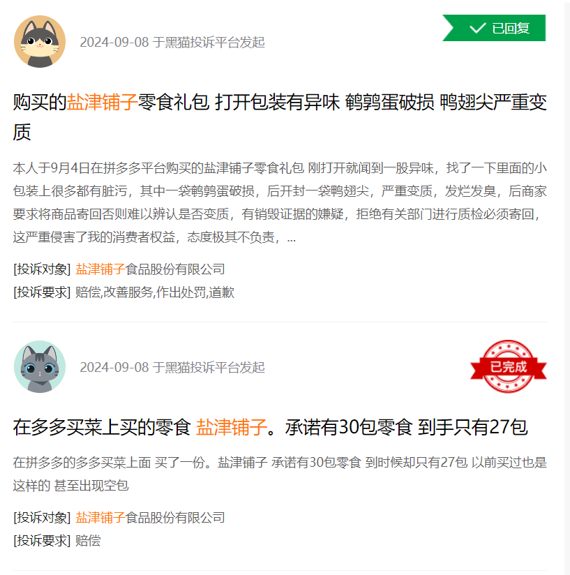 除此以外,作为国内为数不多自建生产线的休闲小零食品牌商,盐津铺子的低价与高性价比,也带来了产品质量与食品安全问题,在互联网上,各种消费者投诉也是屡见不鲜。