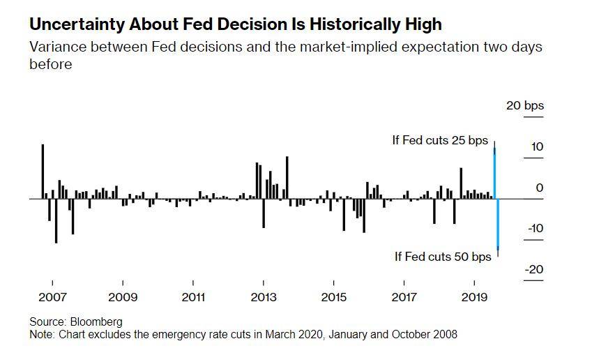 距离美联储宣布降息仅剩两天,美国利率市场就其是会降息25个基点还是50个基点争执不下。根据彭博社汇编的数据,除了美联储在2020年3月疫情爆发时紧急降息外,这是自2007年以来利率掉期交易员对美联储任何预定会议决策的最大怀疑。