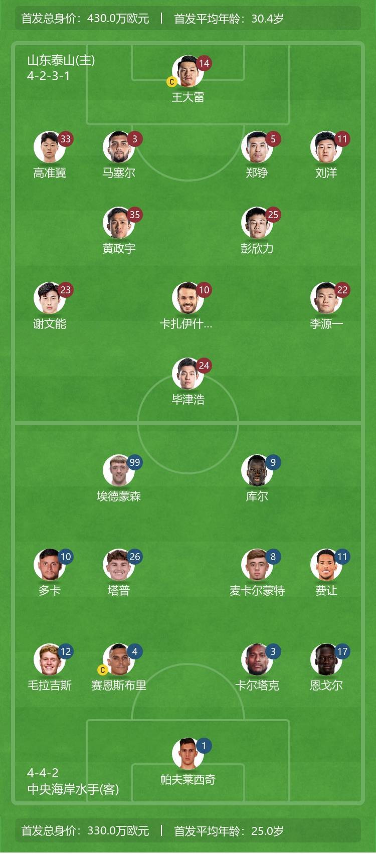 据德转数据统计,泰山首发11人的身价为430万欧,中央海岸水手首发11人的身价则为330万欧。