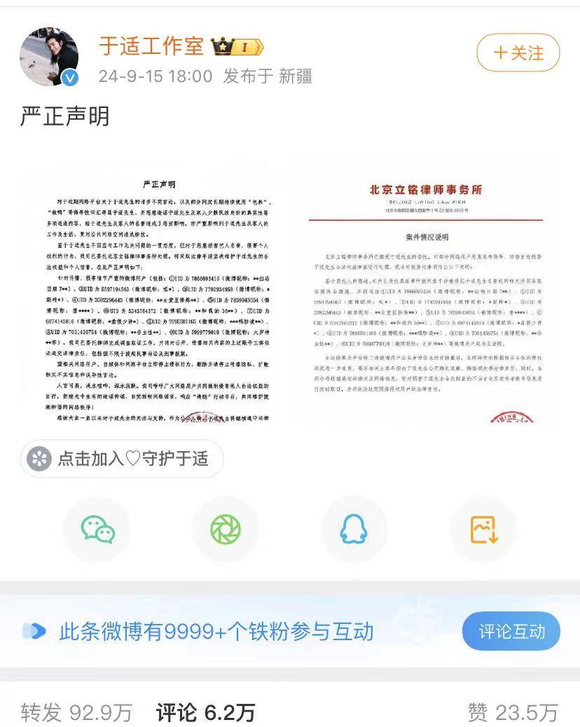 于适的绯闻八卦被张雨绮引爆,持续上了很多天的热搜,这其中的是是非非大家可能都心知肚明,但当事人张雨绮表演脱口秀之前让大家不要对号入座,所以舆情爆发后,于适方发布律师声明,将针对众多微博网友提起上诉,因为他们侮辱于适,侵犯他的名誉权,而于适方面也不会回应除工作以外的事情。