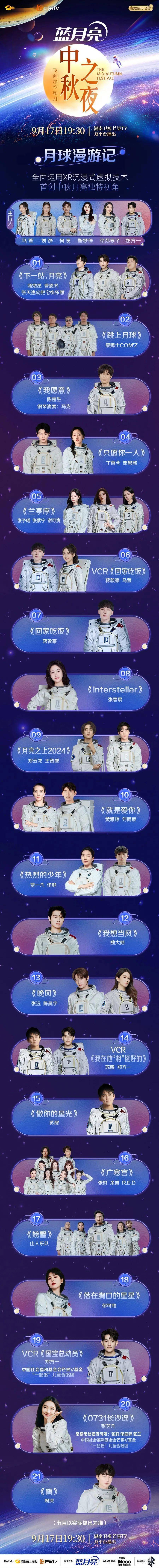 ——湖南卫视、芒果TV推出的《2024湖南卫视芒果TV蓝月亮中秋之夜》,以“飞向星空和月”为主题,主持人和嘉宾们乘坐T2024次地月快线“登月”,共同缔造“月球限定秀”。这是一次望月与探月的深度融合,主打“科技与狠活”,通过全面运用XR(扩展现实)和AI(人工智能)技术,在行业顶尖媒体艺术创意及虚拟视觉制作的支持下,以文化作核,用视效赋能,开启一场如梦如幻、震撼心灵且充满烟火气的“月球奇妙夜”。