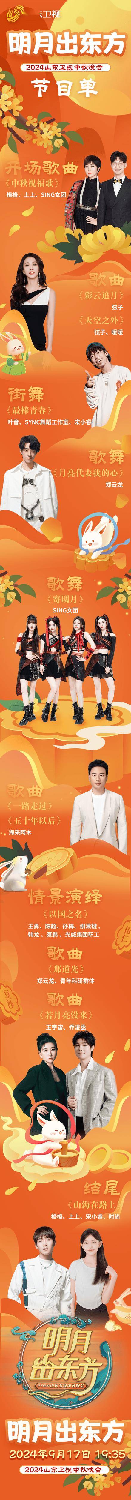 ——山东卫视创作的“明月出东方”2024山东卫视中秋晚会,将于9月17日19:35在山东卫视大小屏同步播出。海来阿木、弦子、郑云龙、上上、格格、王宇宙、叶音等歌手和舞者实力加盟。晚会以“明月出东方”为主题,以月升、月明、月盈、月和四个传统文化意象为架构,展现文化与传统、烟火与温情、收获与发展、家国与世界,立足国际视野,讲好中国故事山东篇章。晚会舞美设计充分利用威海临港新芽广场地形优势,打造“山海月明、新芽勃发”水上舞台,千里山海层叠、朗朗明月闪耀,在广场水面形成美丽的倒影,塑造了浪漫美满的中秋佳节氛围。