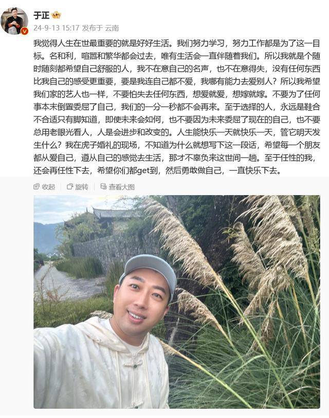 随后,于正发长文回应争议:“我觉得人生在世最重要的就是好好生活。我们努力学习,努力工作都是为了这一目标。名和利,喧嚣和繁华都会过去,唯有生活会一直伴随着我们。所以我就是个随时随刻都希望自己舒服的人,我不在意自己的名声,也不在意得失,没有任何东西比我自己的感受更重要,要是我连自己都不爱,我哪有能力去爱别人?所以我希望我们家的艺人也一样,不要怕失去任何东西,想爱就爱,想嫁就嫁。不要为了任何事本末倒置委屈了自己,我们的一分一秒都不会再来。至于选择的人,永远是鞋合不合适只有脚知道,即使未来会如何,也不要因为未来委屈了现在的自己,也不要总用老眼光看人,人是会进步和改变的。人生能快乐一天就快乐一天,管它明天发生什么?我在虎子婚礼的现场,不知道为什么就想写下这一段话,希望每一个朋友都从爱自己,遵从自己的感觉去生活,那才不辜负来这世间一趟。至于任性的我,还会再任性下去,希望你们都get到,然后勇敢做自己,一直快乐下去。”