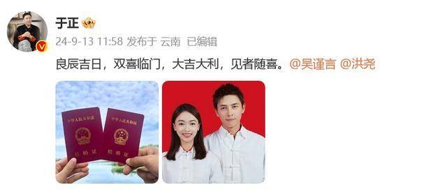 吴谨言所属公司老板于正发文送祝福:“良辰吉日,双喜临门,大吉大利,见者随喜。”