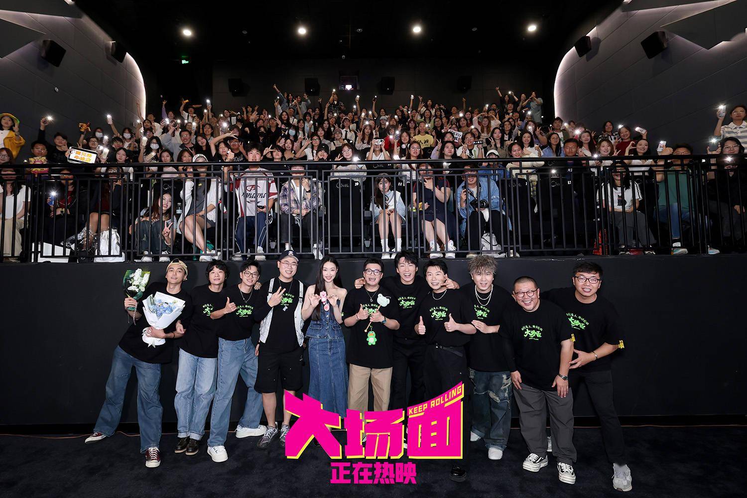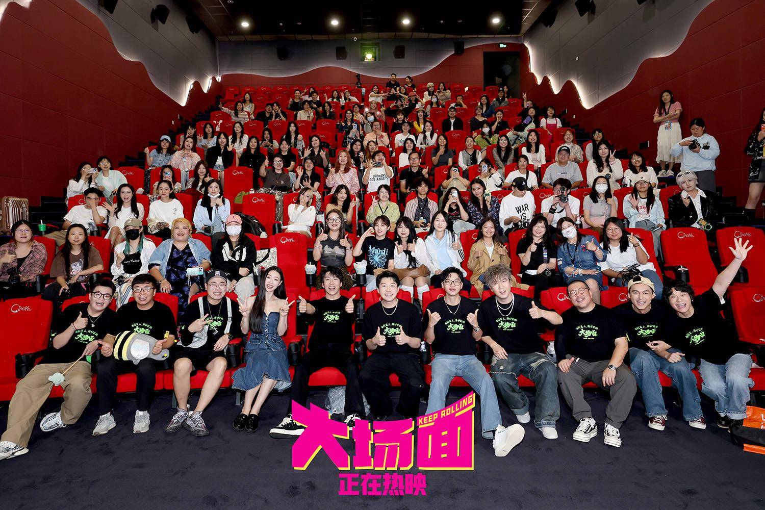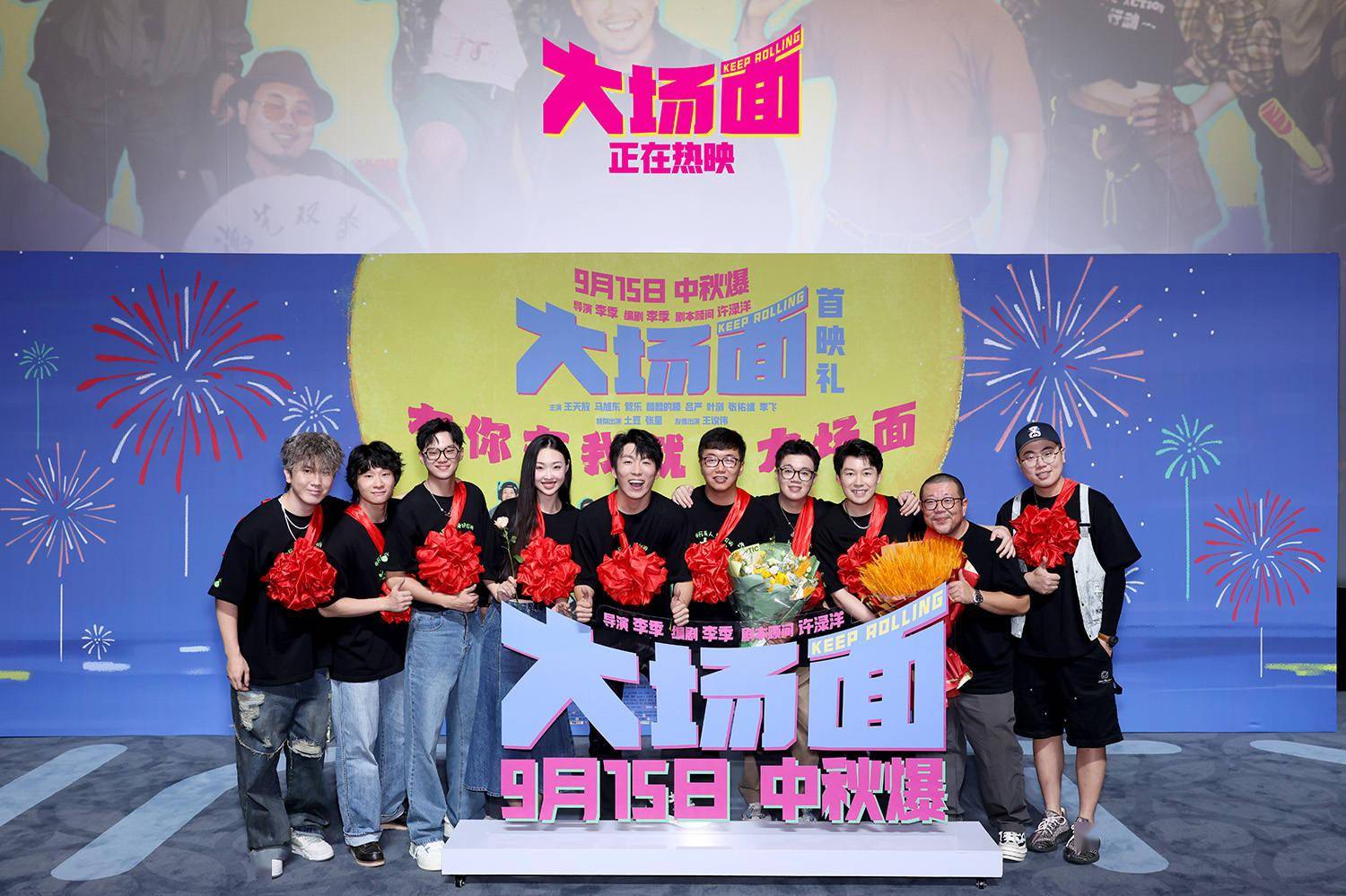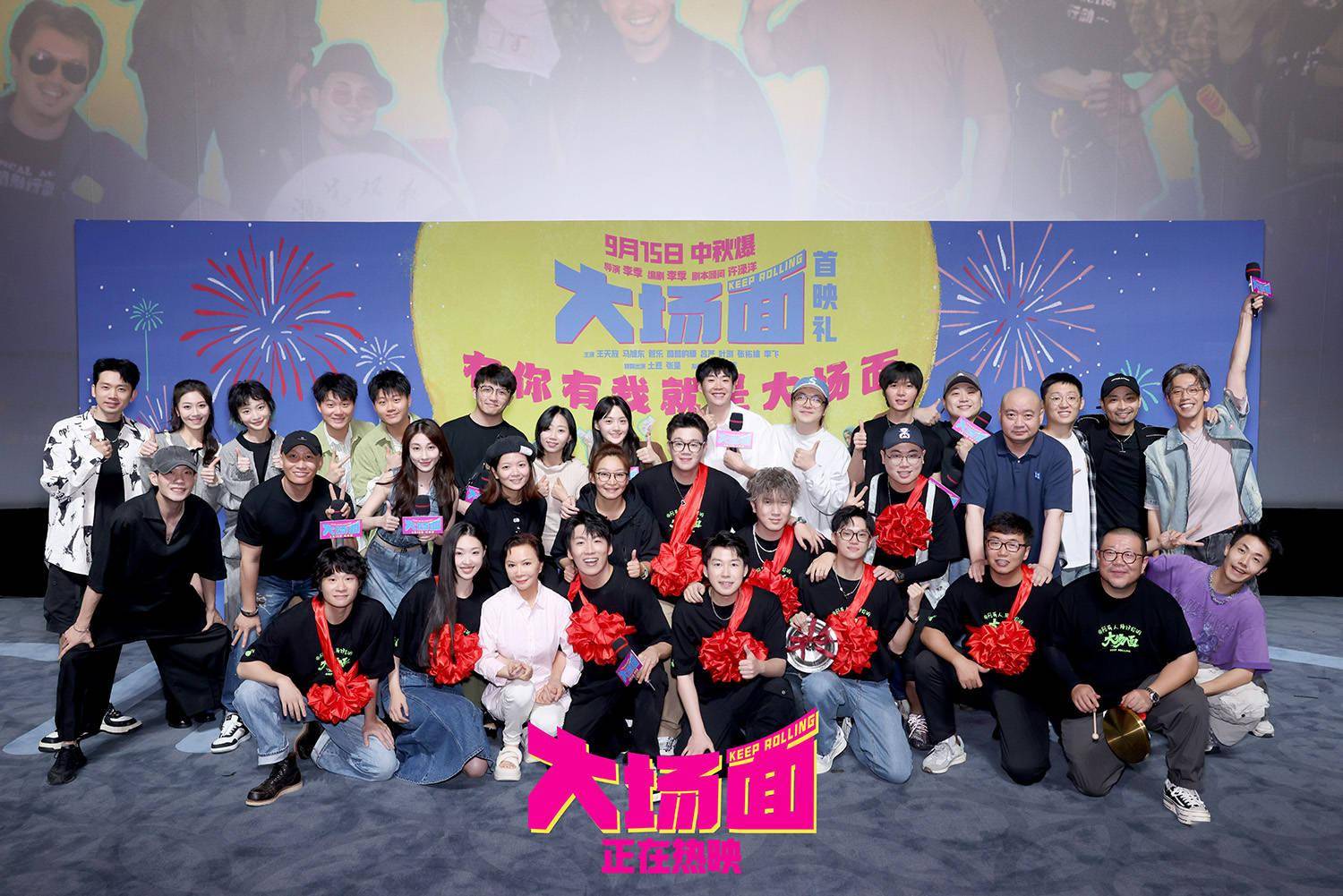 “从第26秒就炸场了,爆笑好几回”由李季执导、编剧,刘然担任制片人,王天放、马旭东、管乐、酷酷的滕、吕严、叶浏、张祐维、李飞、土豆、张呈十位“喜人”首次共同主演的灾难喜剧电影《大场面》9月15日正式上映咯!喜人们敲锣打鼓又尖叫,在“有你有我就是大场面”首映礼上尽情撒欢儿,迎接属于喜人喜剧的高光时刻。蔡明、刘天池、中影股份总经理助理、中影发行、中数发展总经理张大勇等前辈给喜人戴上喜气洋洋大红花。史策、宋木子、刘同、左凌峰、刘思维、朱美吉、李丁、高超、高越、张小婉、罗圣灯、李逗逗等二十余位喜人好友们喜作一团,使相talking、临场起舞、翻跟头,为“喜人升学宴”干一杯,喜人壮行,中秋能行!观众们用“让中秋节都变喜庆了”、“包袱一个比一个响,我一个干喜剧的都乐疯了”、“没别的,纯好笑”、“没有死角的爆笑”为《大场面》送上第一“嘴”好评,多喜人呐!