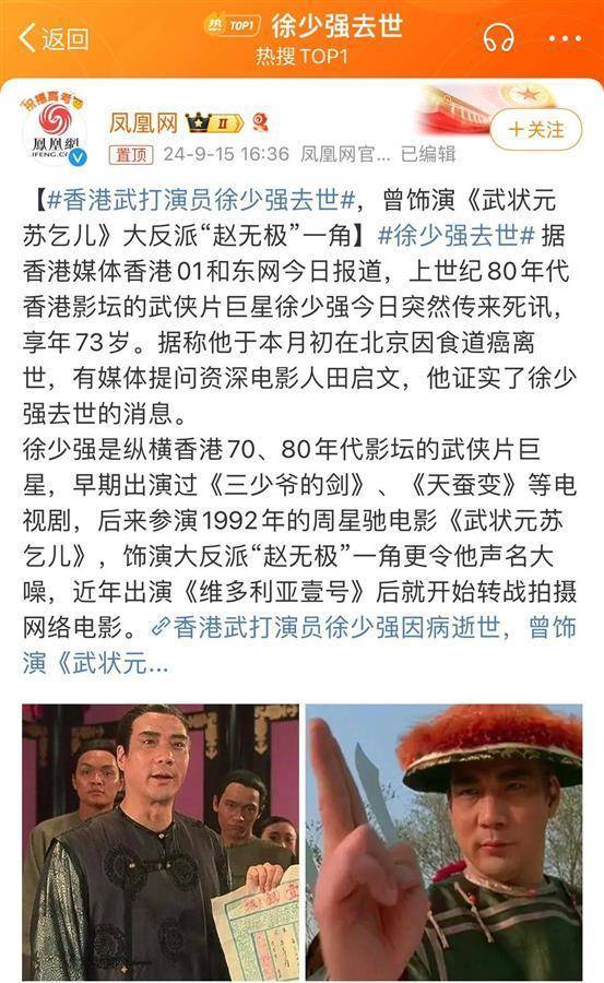 9月15日,多家媒体报道中国香港著名演员徐少强因病过世,并称该消息得到徐少强子女确认,香港知名影视人田启文也接受媒体采访透露了相关细节。