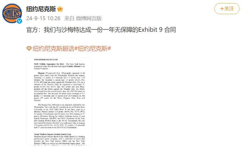 今年休赛期,东部的军备竞赛比西部更疯狂。北京时间9月15日,尼克斯官方宣布,球队正式签下沙梅特。很多人以为这是一份底薪合同,其实并不是。尼克斯只给了沙梅特一份包含Exhibit 9条款的训练营合同,无保障、且薪资极低。