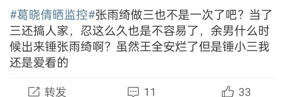 舆论越闹越大,有网友指出这并非张雨绮第一次插足了,当初她和王全安在一起,王全安和余男交往,喊话余男出来锤张雨绮。