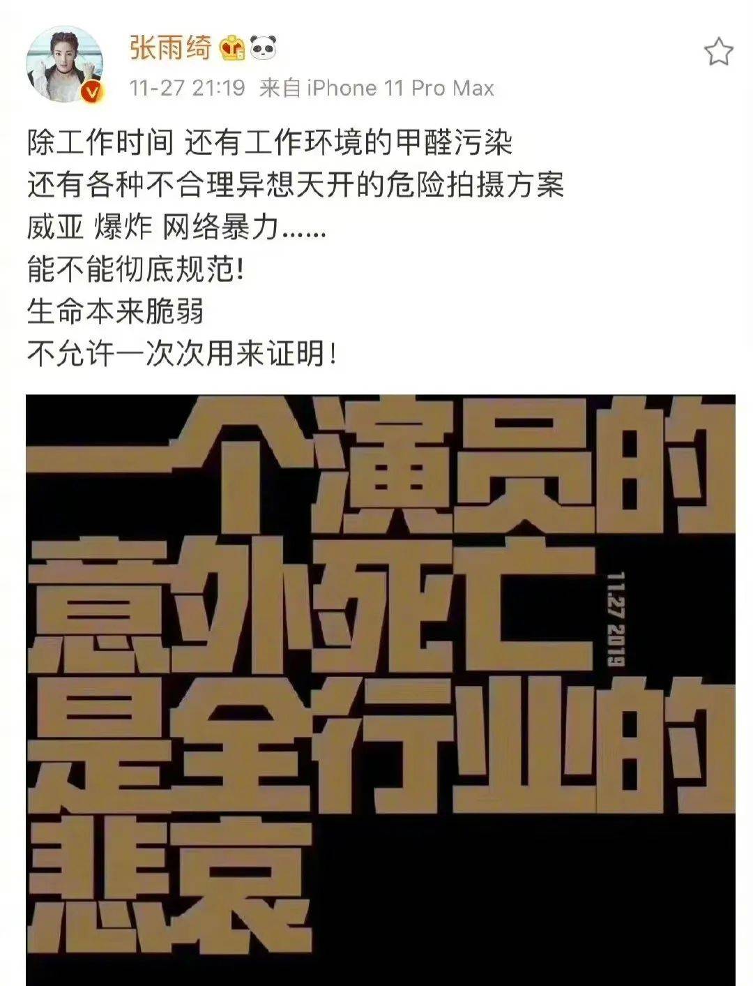 不仅如此,张雨绮还曾发文说演员是高危职业,引起了很多人的不满,被说是强行蹭热度。