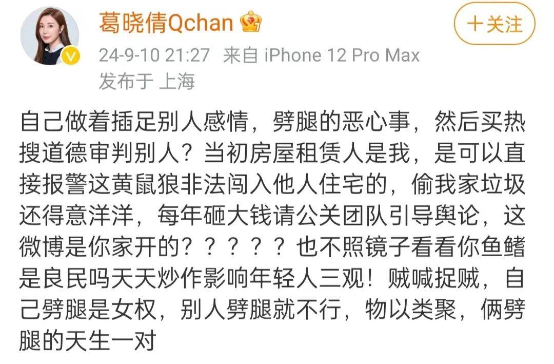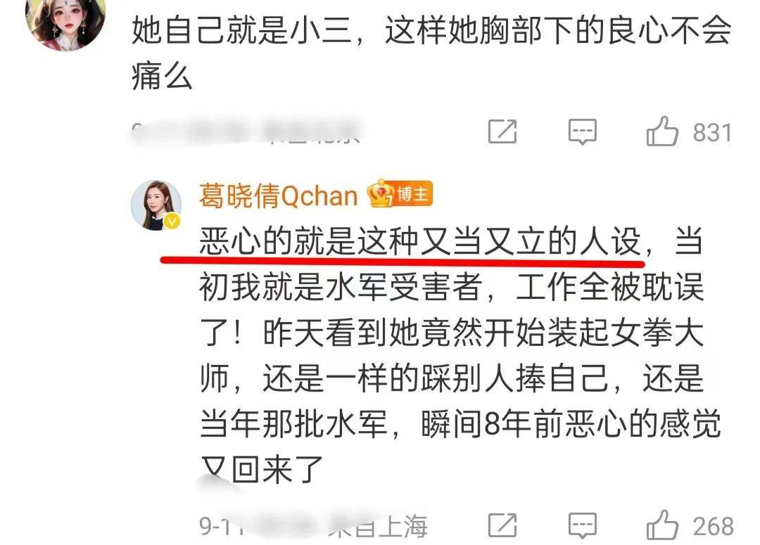 葛晓倩在评论区留言,表示非常恶心这种又当又立的人设,通过踩别人来捧自己,她字里行间都对张雨绮感到不满和厌恶。