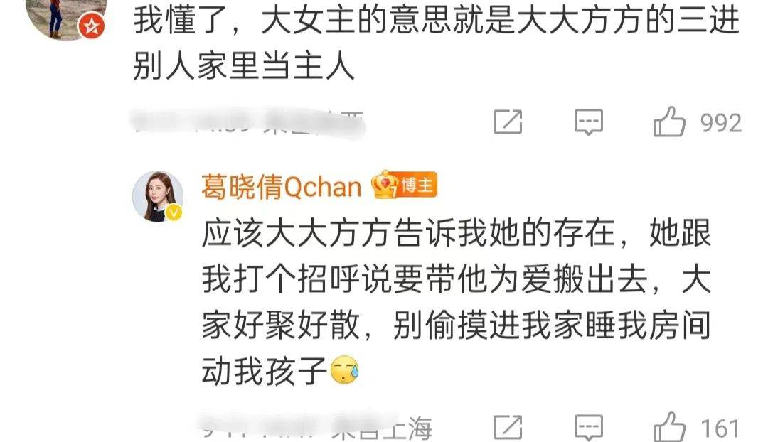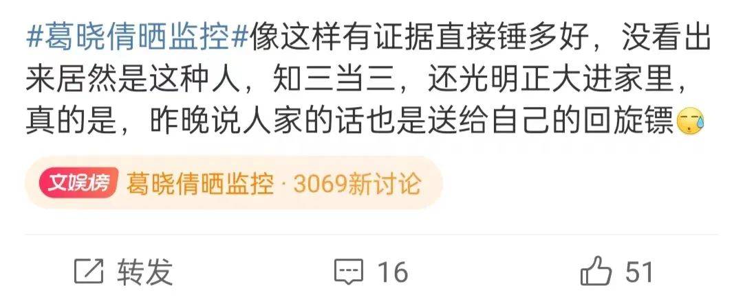 原本舆论的焦点在劈腿的于适,很多人讨论他的前任,葛晓倩的实锤监控放出后,矛头指向了张雨绮,有网友讽刺这就是所谓的大女主,葛晓倩回复称可以大大方方告诉她,而不是偷摸进她家睡她房间动她孩子。