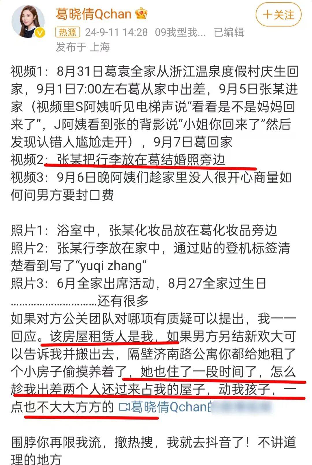 原本以为事情到这里就结束了,没想到9月11日,葛晓倩放出监控画面,再次指控张雨绮插足。她说张雨绮直接找上门,态度嚣张强硬,趁她出差期间霸占她的房屋,动她的孩子,一点都不大大方方。