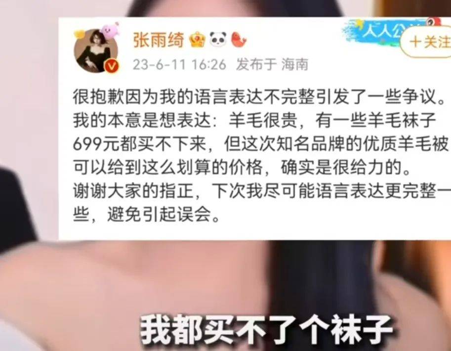 另外,张雨绮还曾在直播间说699元买不了一双袜子,被指高高在上,难以与普通人共情。之后她发文道歉,解释称她说的是羊毛袜,以后语言表达会更加完整一点,避免引起误会。