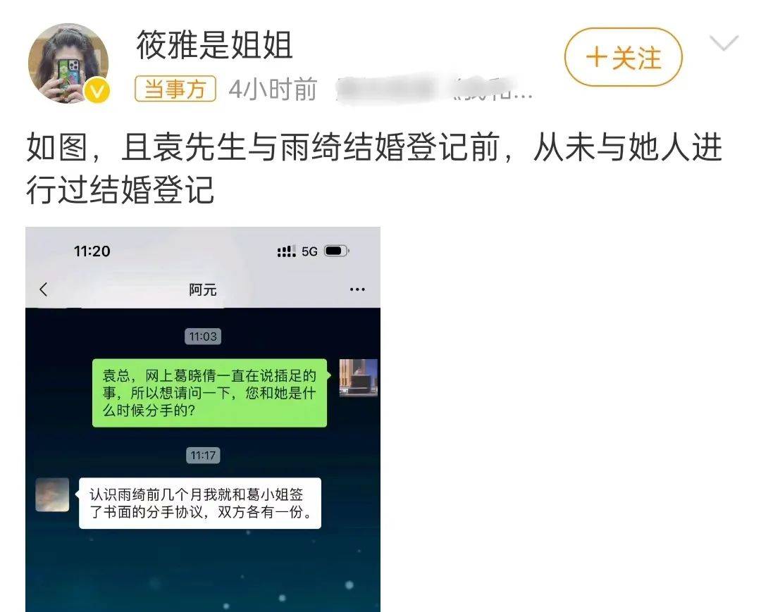 后来,张雨绮经纪人发文,否认插足,表示袁巴元在与张雨绮登记前,从未与她人有过结婚登记,他在认识张雨绮之前就和葛晓倩分手了。