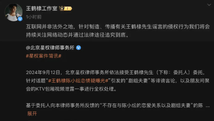 针对恋情传闻,王鹤棣工作室起诉爆料人:“互联网并非法外之地,针对制造、传播有关王鹤棣先生谣言的侵权行为我们将会持续关注网络动态并通过法律途径追究到底。”
