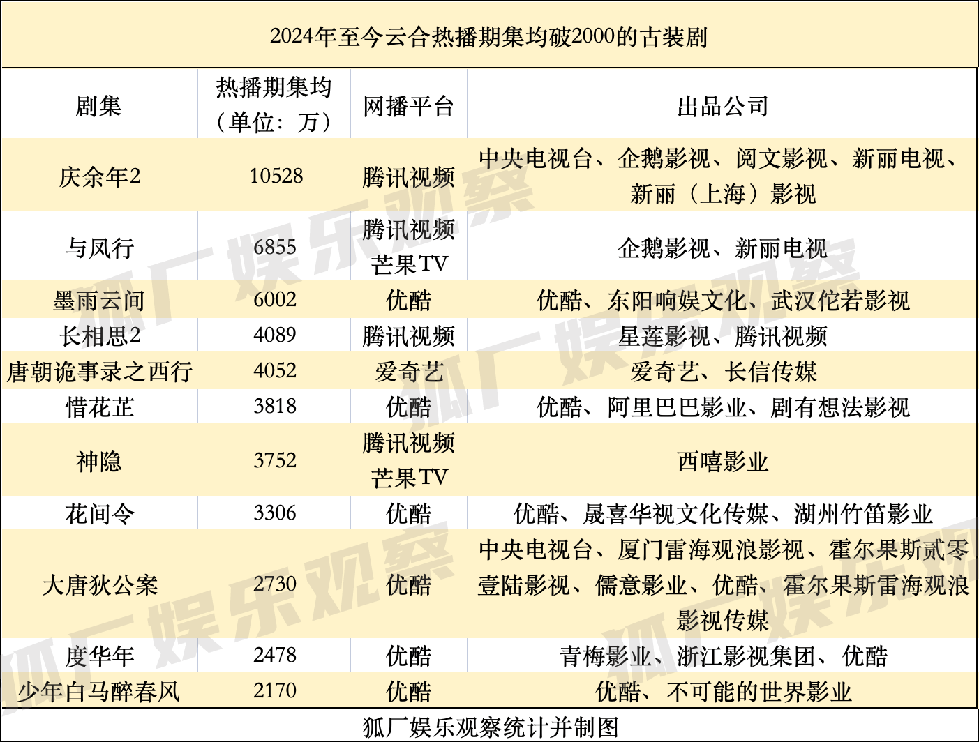 根据公开的云合数据推算,2024年热播期集均播放量超过2000万的古装剧仅10部,分别是《庆余年2》、《与凤行》、《墨雨云间》、《长相思2》、《唐朝诡事录之西行》、《惜花芷》、《神隐》、《花间令》、《大唐狄公案》、《度华年》、《少年白马醉春风》。