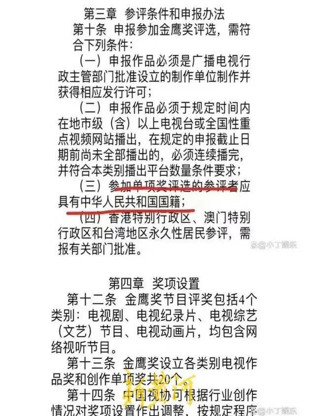 据公开资料显示,金鹰奖评选规定之一,要求参评者必须具备中国国籍,港澳台地区参评者需要有关部门批准。违法失德艺人和其参演的作品都不得参与评选。而刘亦菲是美国国籍,不符合金鹰奖的入围要求。在其二轮入围后,遭到网友质疑,于是官方删除了刘亦菲入围资格。