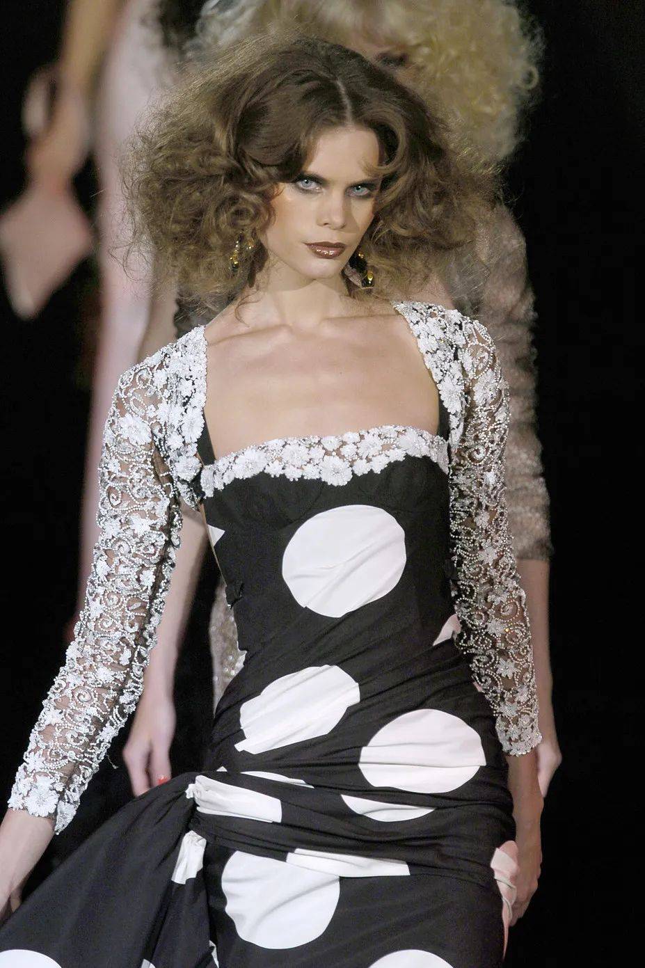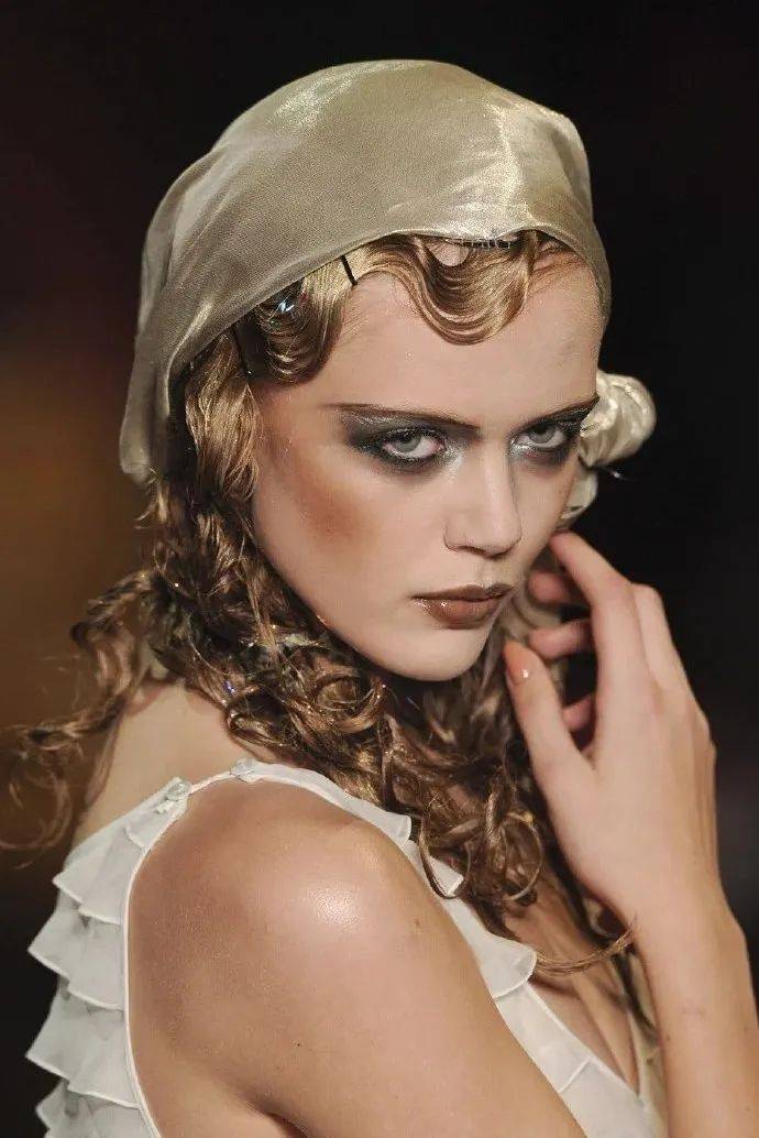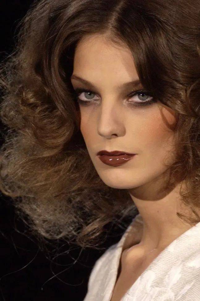 在2004年春夏Valentino高定秀场上,模特们的烟熏妆令观众耳目一新。带有金属质感的灰色眼影大面积铺在眼窝位置,利用浓郁黑色眼影对下眼睑进行勾勒,加深眉眼之间的深邃感,巧克力色口红作为点睛之笔,整体妆容风格融合了狂放不羁与妩媚性感。