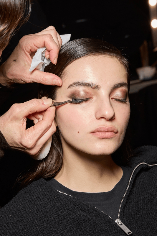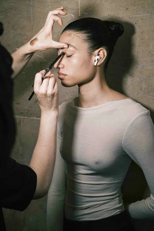 在2024秋冬时装周的后台,化妆师在为模特们打造的烟熏妆中融入了金属质感的眼影,如深灰色、炭黑色或暗紫色眼影,这些色彩在金属光泽的映衬下,既突出了模特眼部的轮廓,也展现出了一种未来主义的冷峻与神秘。