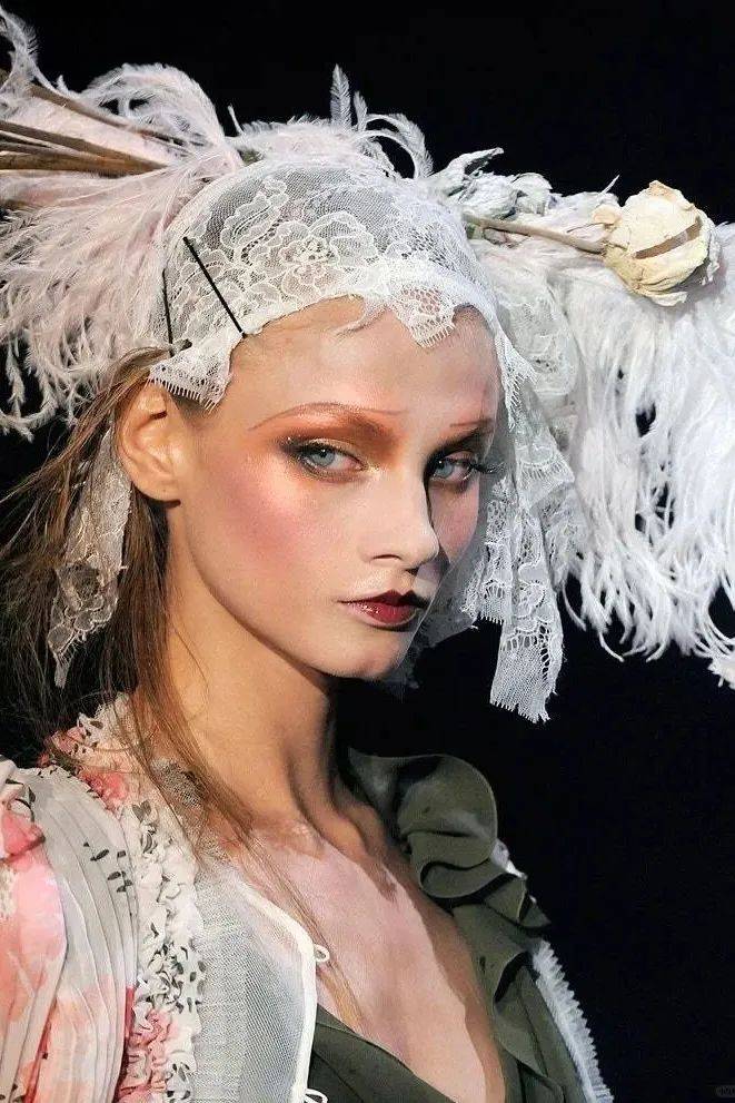 在海盗爷John Galliano的秀场妆容中,巧妙地将复古元素与现代审美相结合,既致敬了经典,保留了上世纪20年代的浓郁烟熏妆和30年代的柳叶眉,又以浓郁的色彩风格留下强烈的视觉冲击力,将眼部妆容与脸部妆容融为一体,妆感更加锋利。
