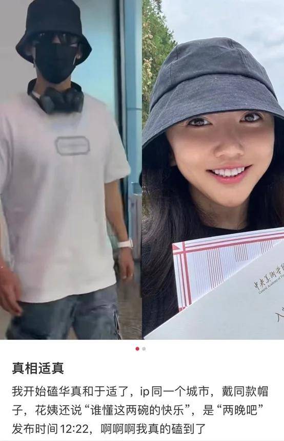 但是有火眼金睛的网友发现,于适和华真疑似戴了同款帽子,而且ip也在同一个城市,并晒出了图片。