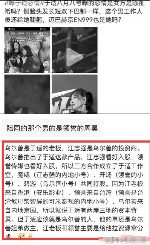 除了与胡连馨的恋情传闻,于适还被传与陈祉希曾同居,陈祉希是电影《热烈》的制片人,四十出头,已婚有娃,值得一提的是,于适也参演了这部电影。而且该网友还透露,目前于适如日中天,是因为他同时有港圈、湾湾、内地三方资本力捧,是个货真价实的资源咖,而陈祉希就是从中牵线搭桥,给他输送资源的金主姐姐之一。