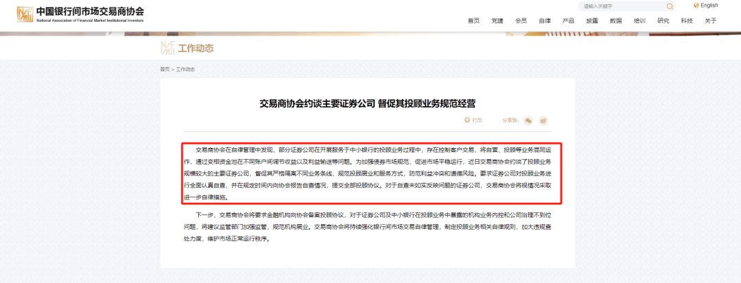 9月11日,银行间市场交易商协会公告称,交易商协会在自律管理中发现,部分证券公司在开展服务于中小银行的投顾业务过程中,存在控制客户交易,将自营、投顾等业务混同运作,通过变相资金池在不同账户间调节收益以及利益输送等问题。