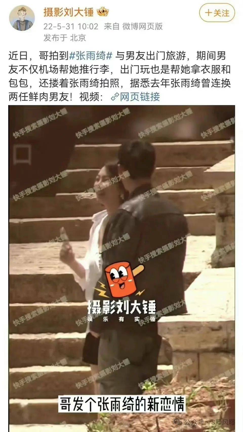 据悉,在2022年5月31日,狗仔拍到张雨绮和男友在一起游玩,两人行为十分亲密,男生还将胳膊搭在张雨绮肩膀上。