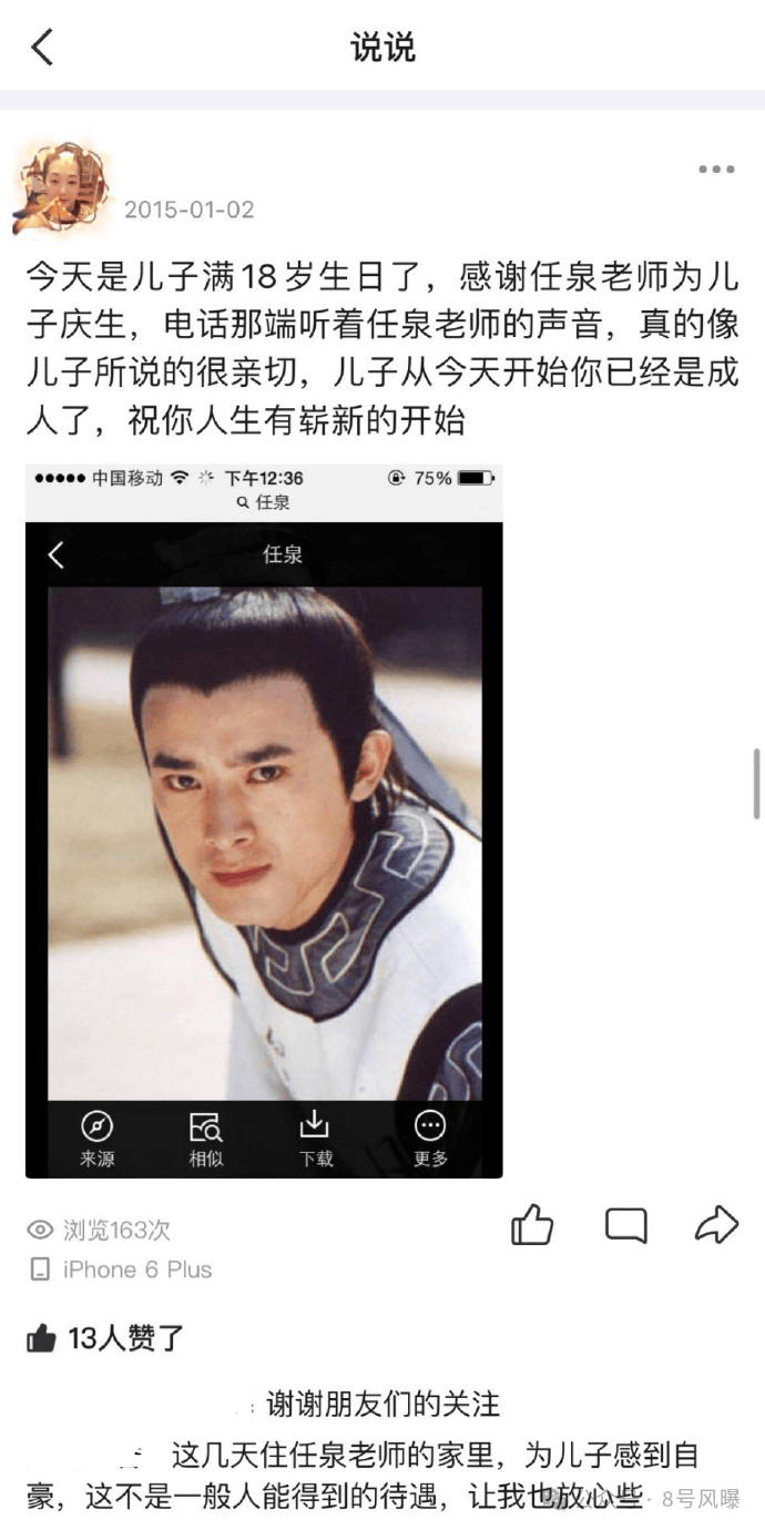 2015年1月,“于是”妈妈炫耀儿子住进公孙策(任泉)家,说对方为自己儿子庆祝18岁的生日,为儿子感到自豪。