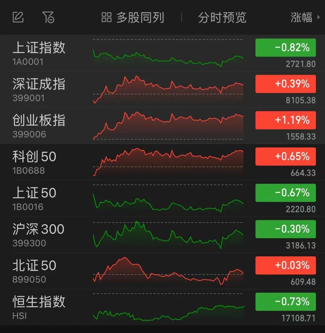 今日,A股两极分化,白马蓝筹股集体调整,上证指数、上证50承压再创阶段性新低,小盘成长股表现活跃,创业板指涨逾1%,科创50指数也小幅飘红。两市成交5011亿元,创近期新低。