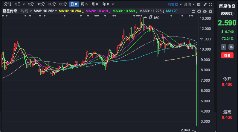 香港市场方面,“周杰伦概念股” 巨星传奇今日暴跌。该股上午10时17分首次触发市调机制而进入5分钟限价交易冷静期,随后继续下挫,盘中多次触发市调机制。截至发稿,暴跌逾72%。