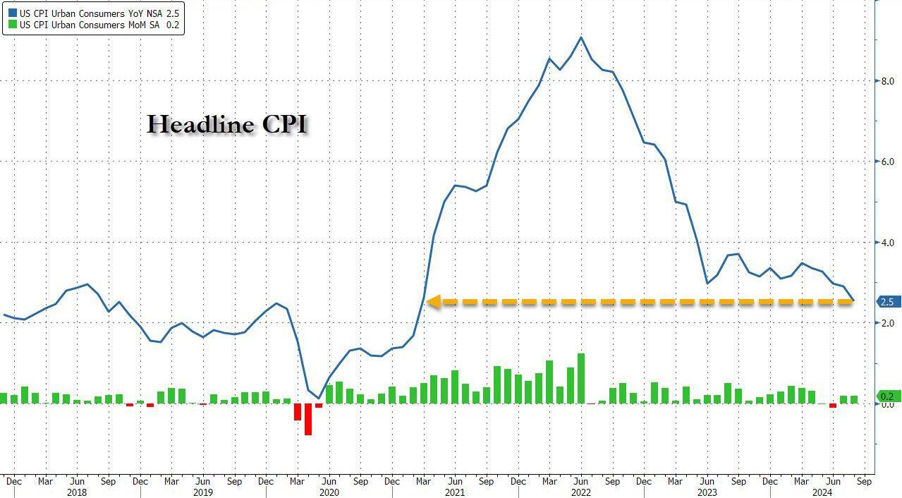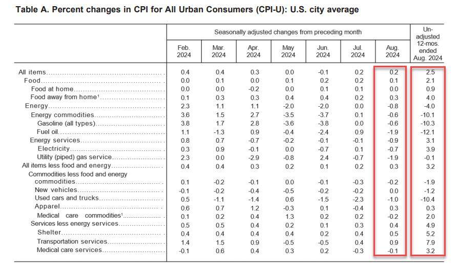 美国8月CPI同比上涨2.5%持平预期,较前值2.9%明显下降,为连续第五个月放缓,为2021年2月以来最低水平,环比上涨0.2%,持平预期和前值。