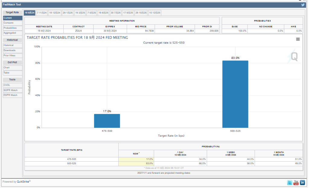 由于核心通胀环比涨幅意外上升,目前CME芝商所工具显示,交易员预计9月降息50基点的可能性降至不到20%,降息25基点的可能性升至83%。