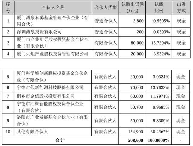 厦门国资之外,浙江桐乡市财政局、福建省宁德市国资委、洛阳市国资委等旗下国资投资平台也纷纷出资。根据公告,桐乡市金信投资出资6亿元,宁德市汇聚新能出资5.07亿元,洛阳市产业发展基金出资5亿元。