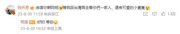 好友陈乔恩在评论区大方送上祝福:“恭喜你啊阿明,等我回台湾再去看你们一家人,还有可爱的小宝宝”。明道回复道:“好的,等你。”