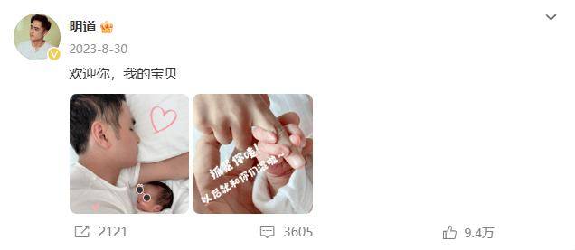 同年8月30日,明道在微博晒出自己与女儿的合影,官宣自己第二个孩子诞生的喜讯:“欢迎你,我的宝贝。”