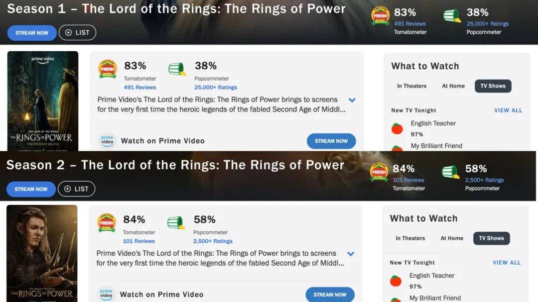 另外,《指环王:力量之戒》第二季的爆米花指数暂为61%,较第一季的“灾难级”评价(38%)有明显改善,但与其他大热剧集相比依旧挣扎,可见粉丝的高期待仍未得到满足。