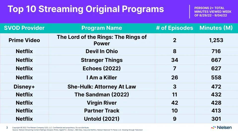 在尼尔森发布的2022年度原创剧集榜中,《指环王:力量之戒》第一季以94亿分钟排在第15名,刚好位居榜单末尾;这一数字甚至逊于同属亚马逊的《黑袍纠察队》,虽然后者录得的106亿分钟共涵盖24集,即为彼时已推出的前三季总计。