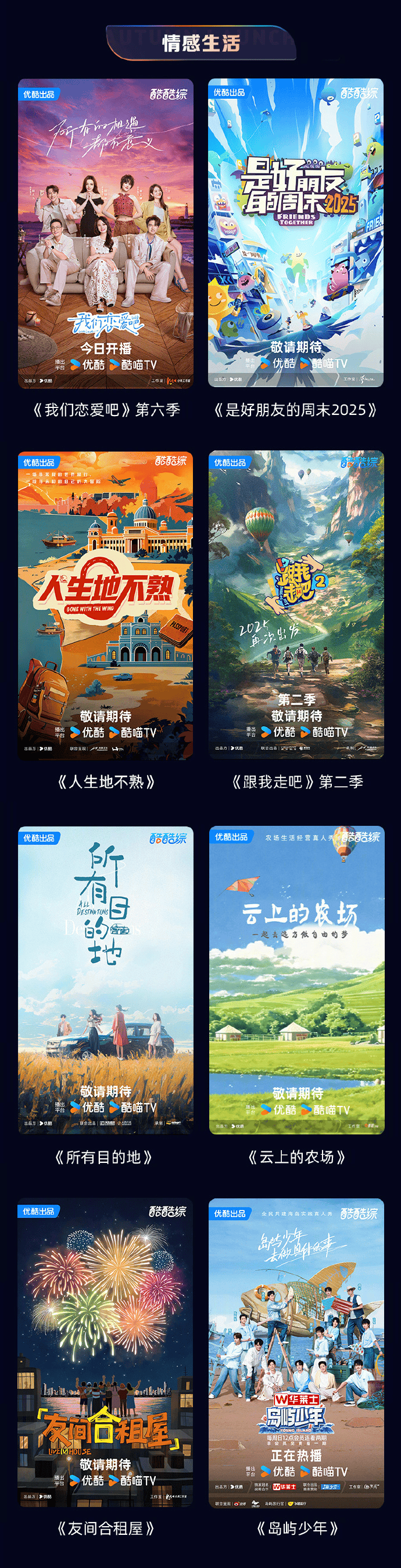 从潮流文化到生活方式的呈现,再到喜剧、生活情感等赛道的年轻化改造,优酷在“懂年轻人”这一点上下了功夫。或许短视频啥都有,但长综艺对年轻人偏好的全景式展示与情绪挖掘,才更有留住受众的底气。